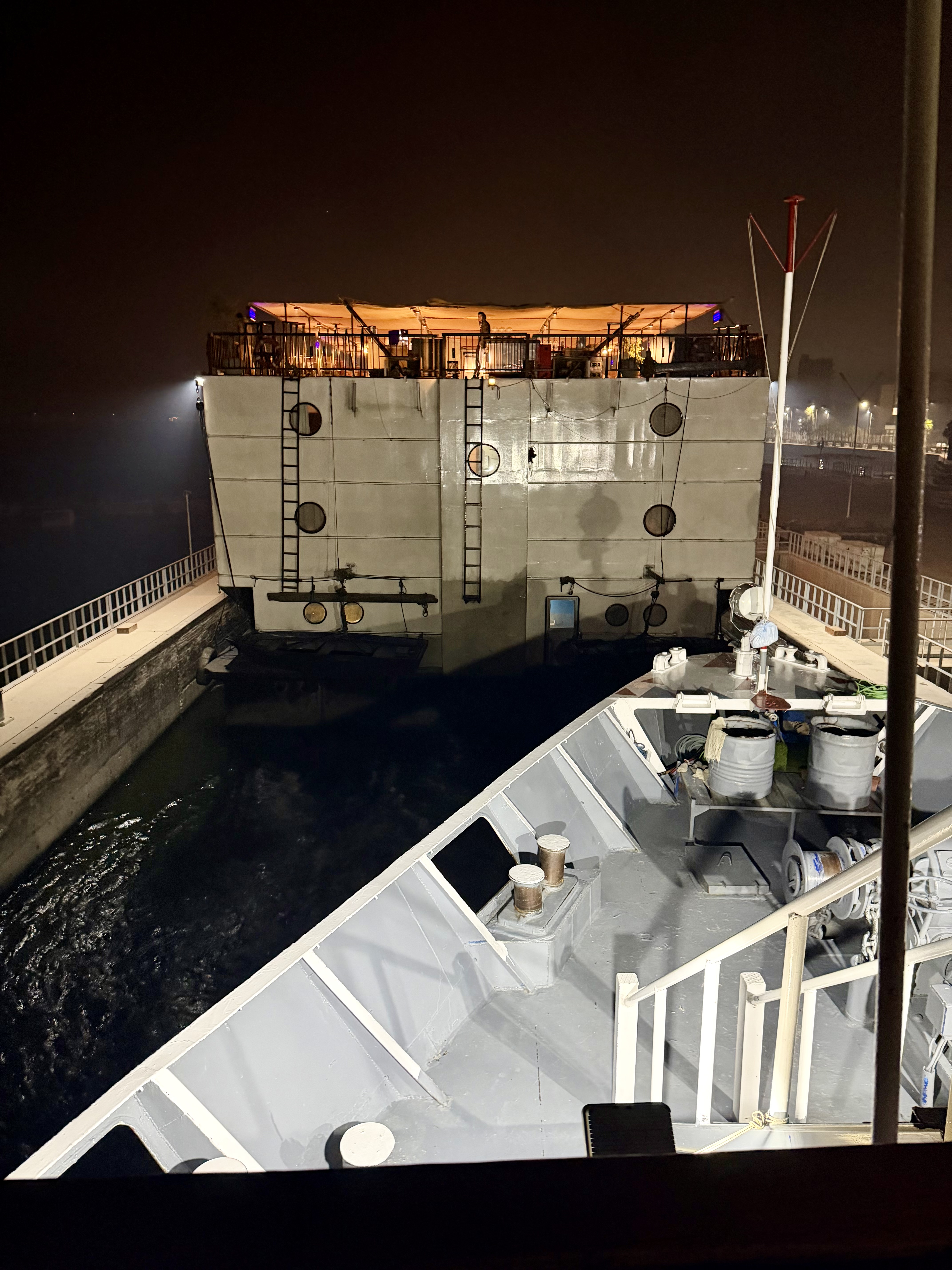 Moonlight reflected off the water as our ship eased into a narrow chamber barely wider than the vessel itself. Other boats lined up behind us, their lights glowing softly against the dark riverbanks.