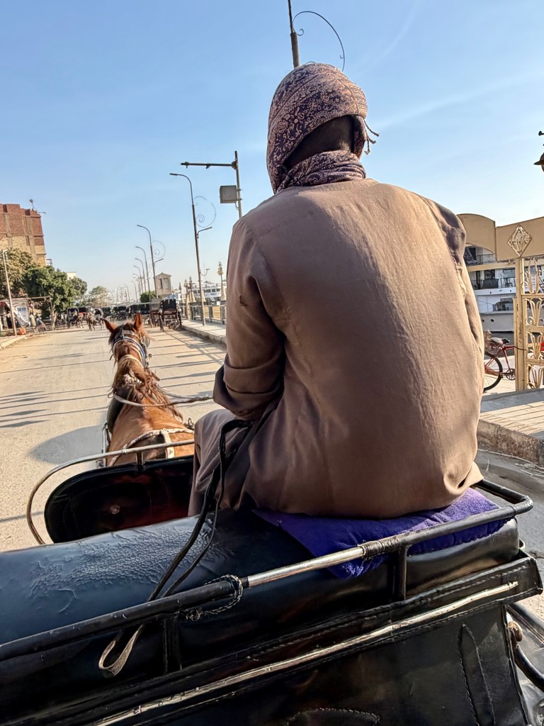 To reach Edfu Temple, we boarded horse-drawn carriages waiting along the dock. The ride itself felt like stepping into another century. Hooves echoed along dusty streets as we passed storefronts, schoolchildren, and locals beginning their day.
