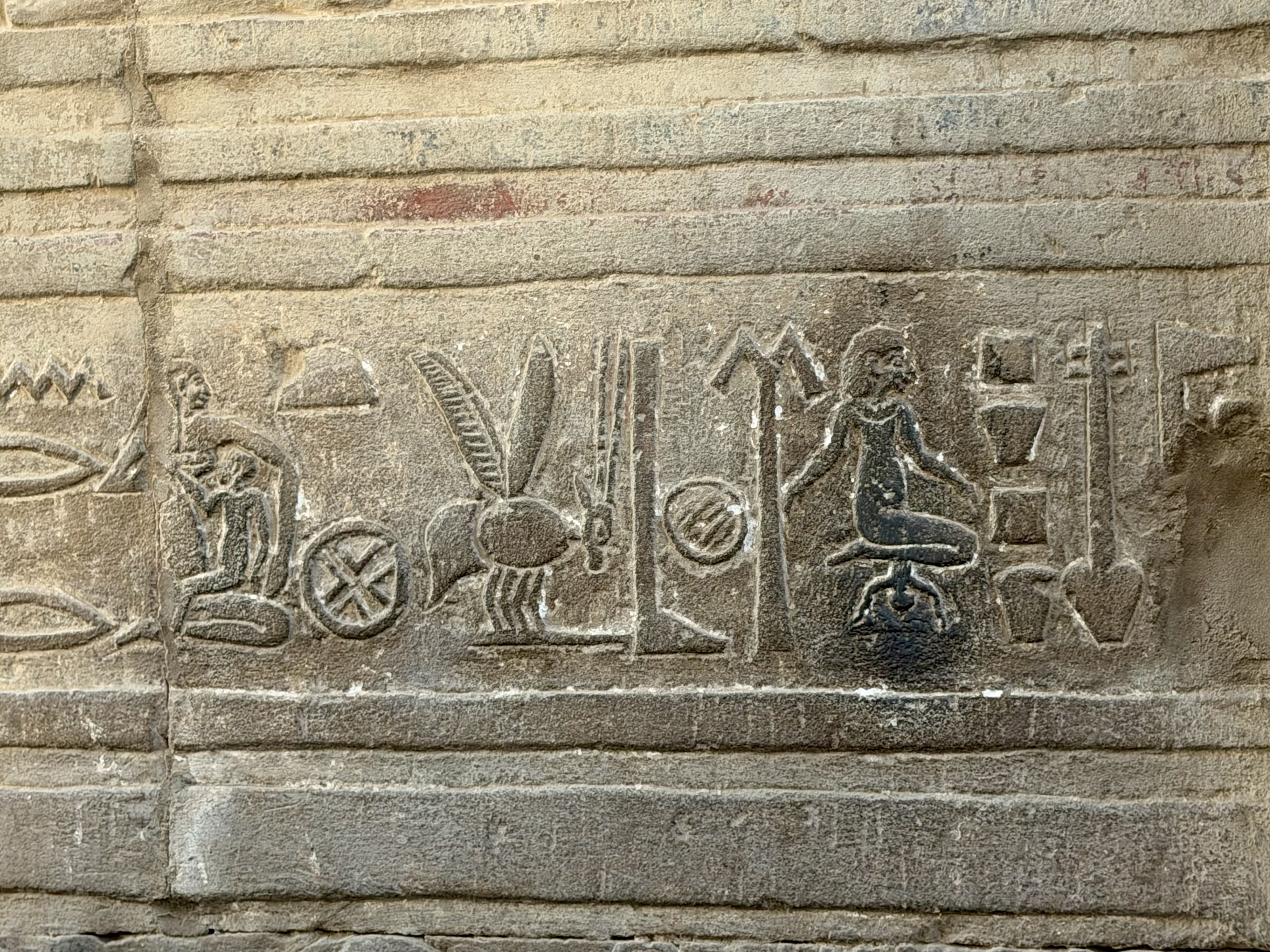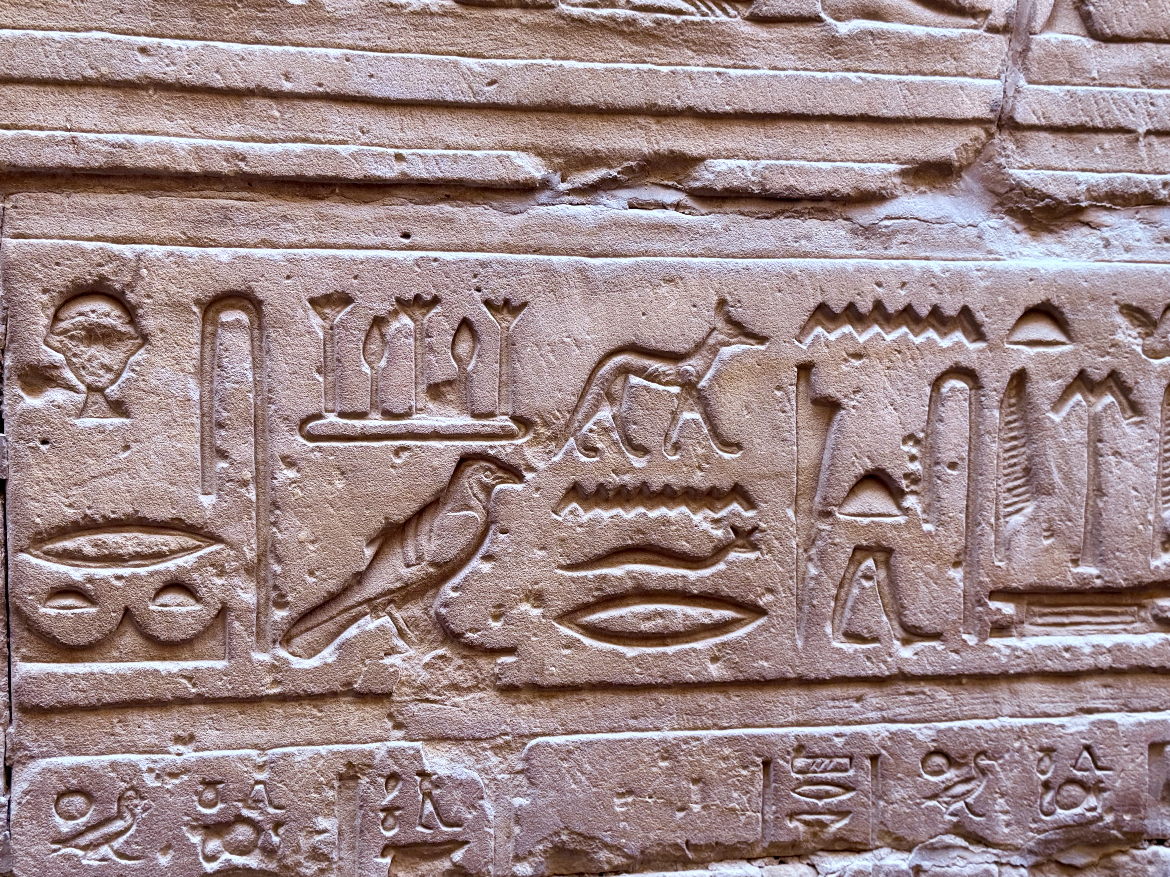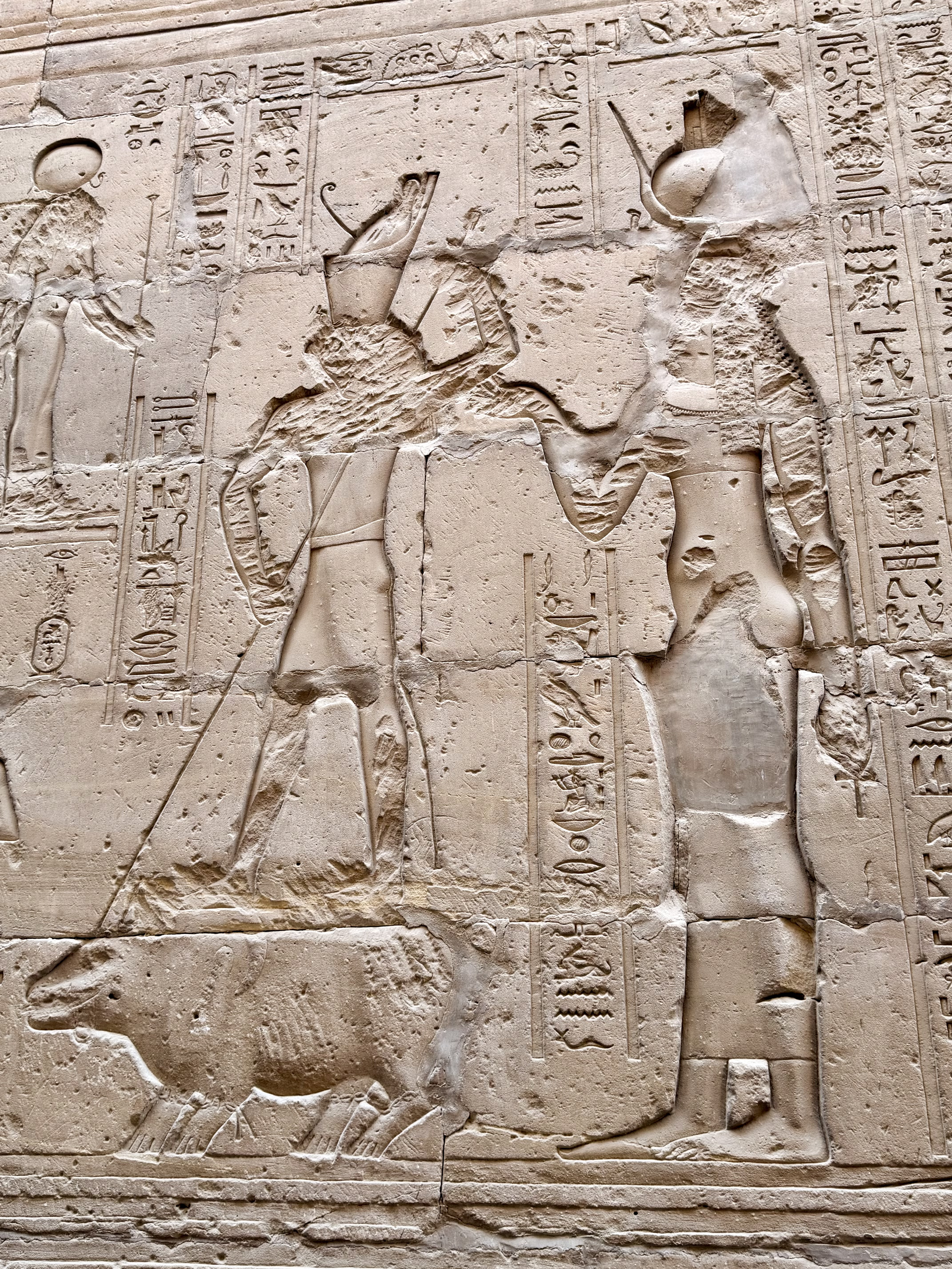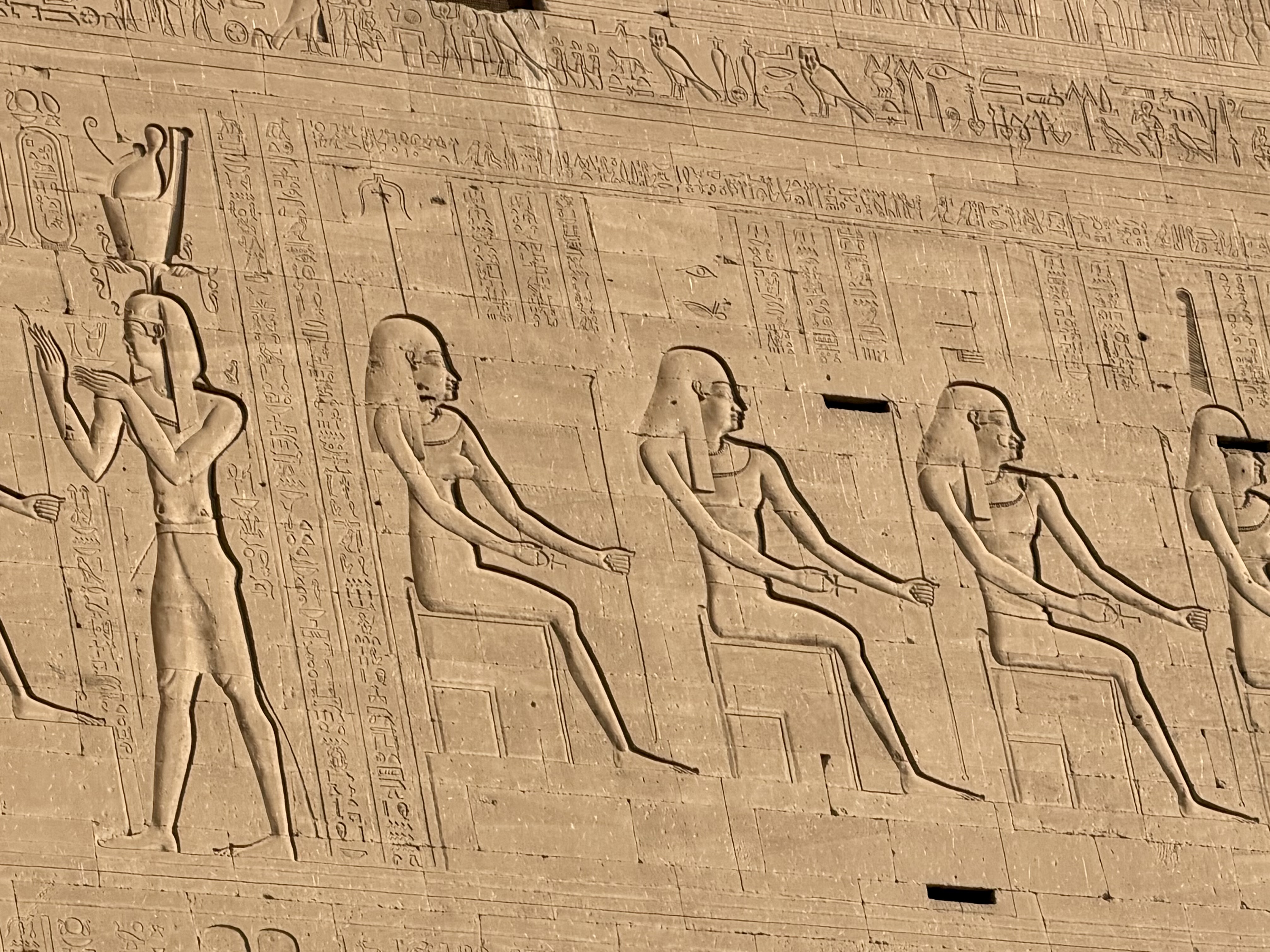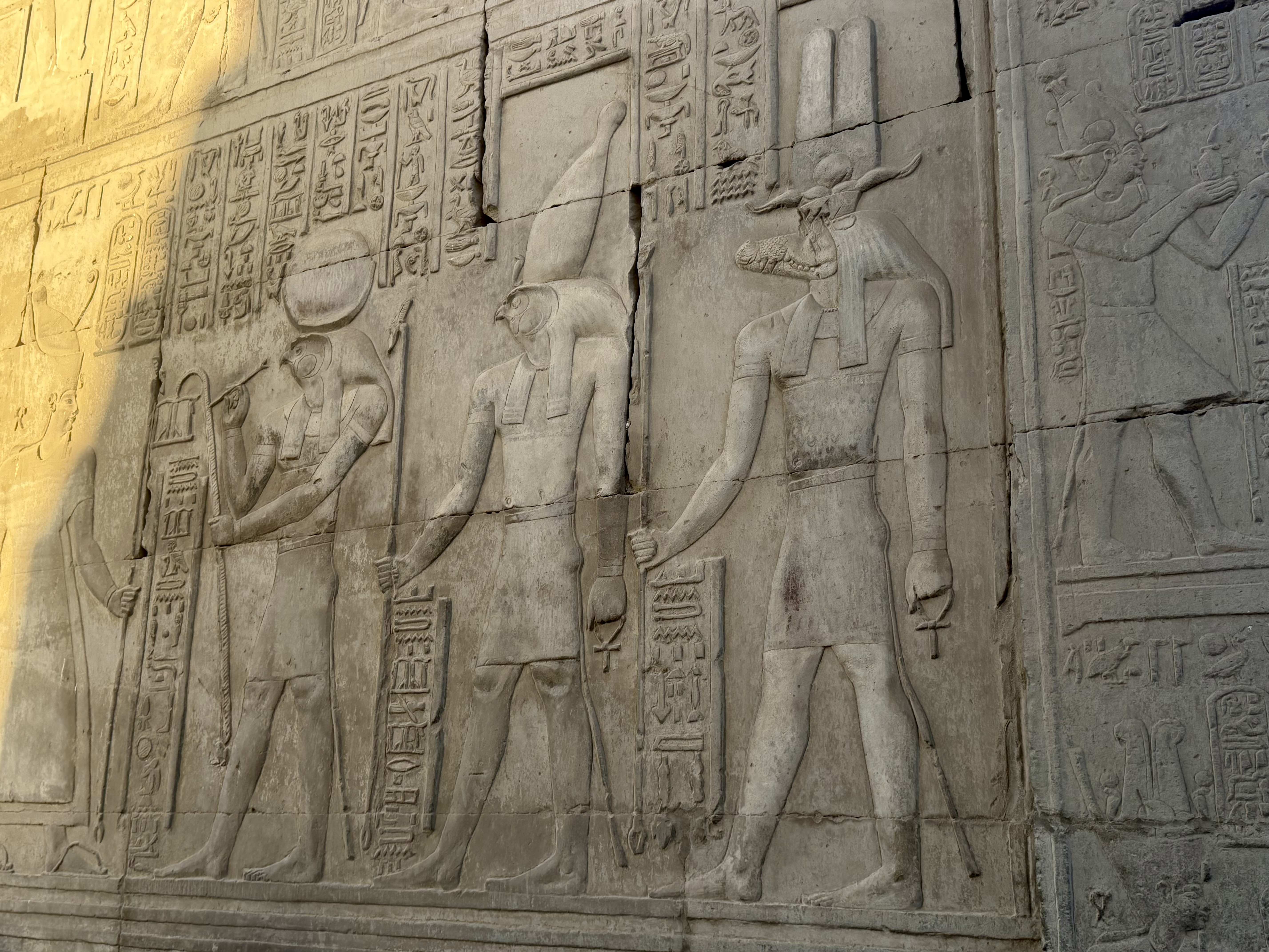 Massive figures tower along the walls, carved in raised relief so deeply that shadows bring them to life even under artificial light. Kings stand beside gods holding ankhs, symbols of life, while vertical hieroglyphic inscriptions record sacred prayers and royal titles.