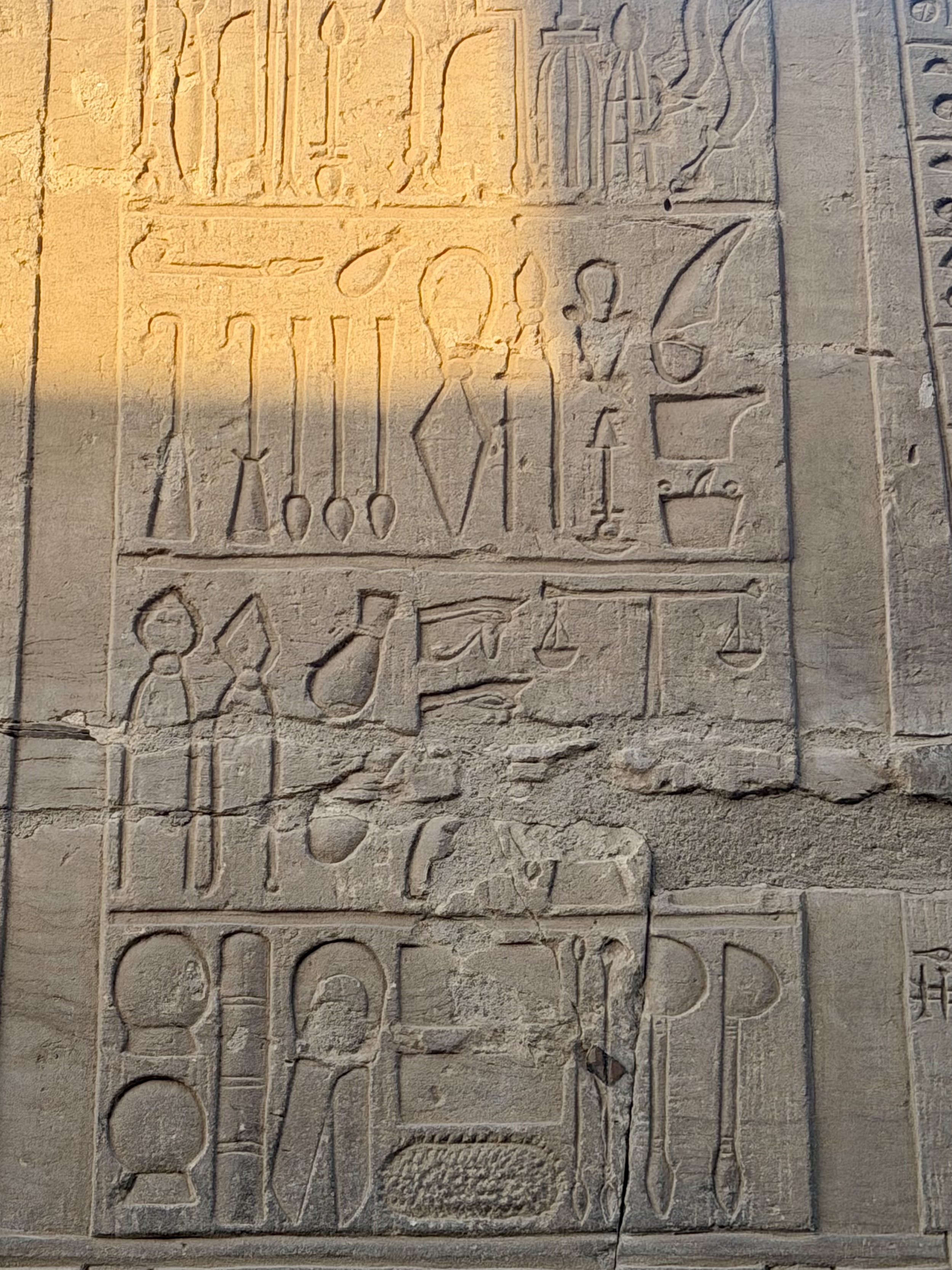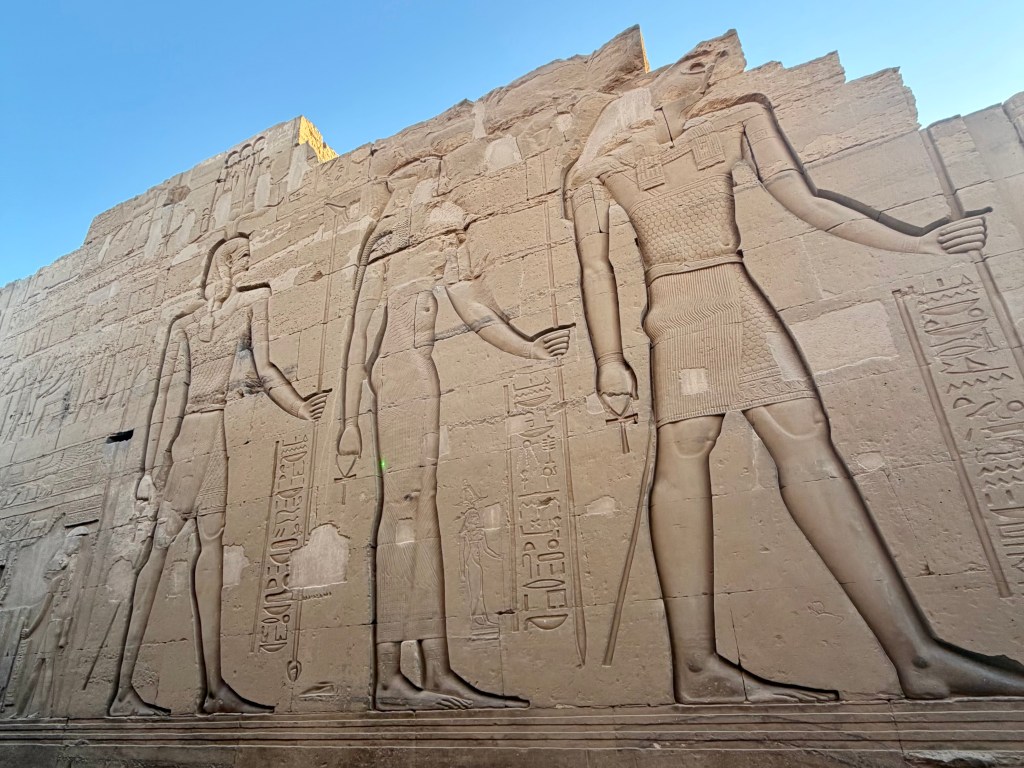 Walking through its massive entrance pylons felt overwhelming in scale. Towering walls covered in carvings depicted pharaohs presenting offerings to the gods, reinforcing divine authority through ritual imagery.