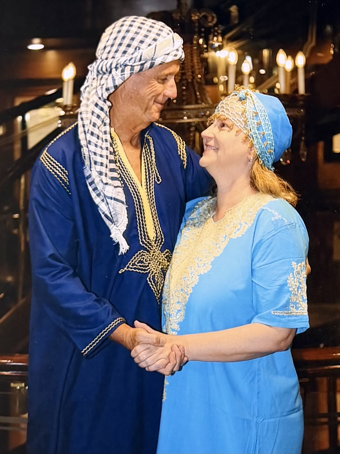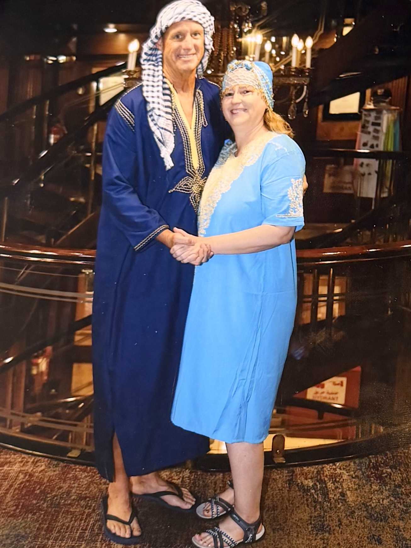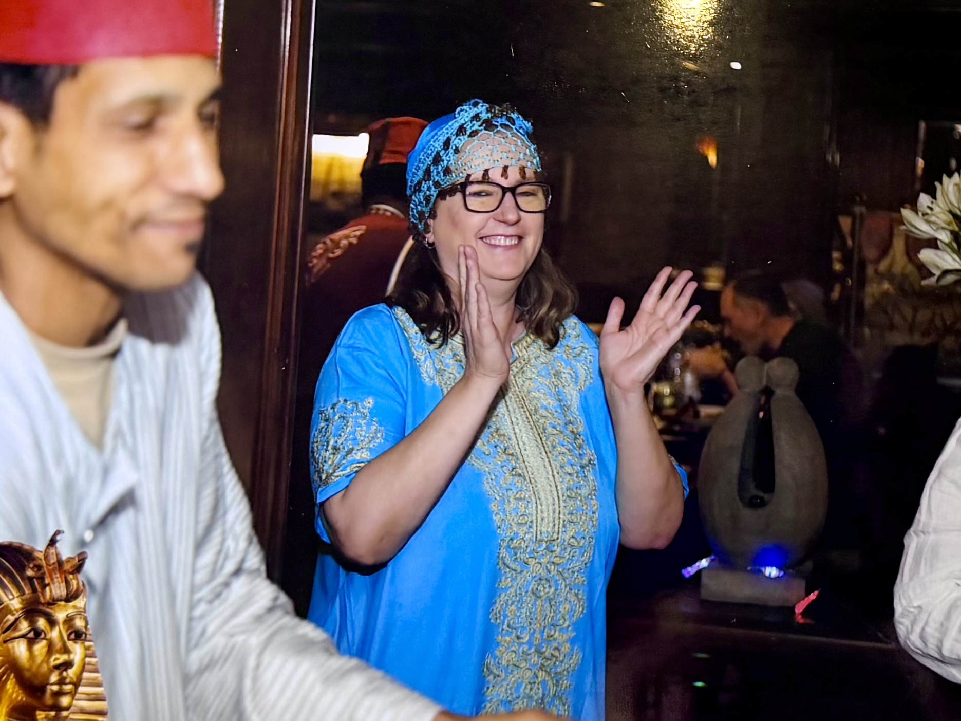 I wore a flowing patterned galabeya in rich blues and gold tones that moved easily as I walked. My husband opted for a classic white version, paired with a traditional head covering the crew helped tie properly earlier that evening. For men, this style of headwear is commonly called a keffiyeh or ghutra, while women often wore decorative scarves or shawls styled more loosely.