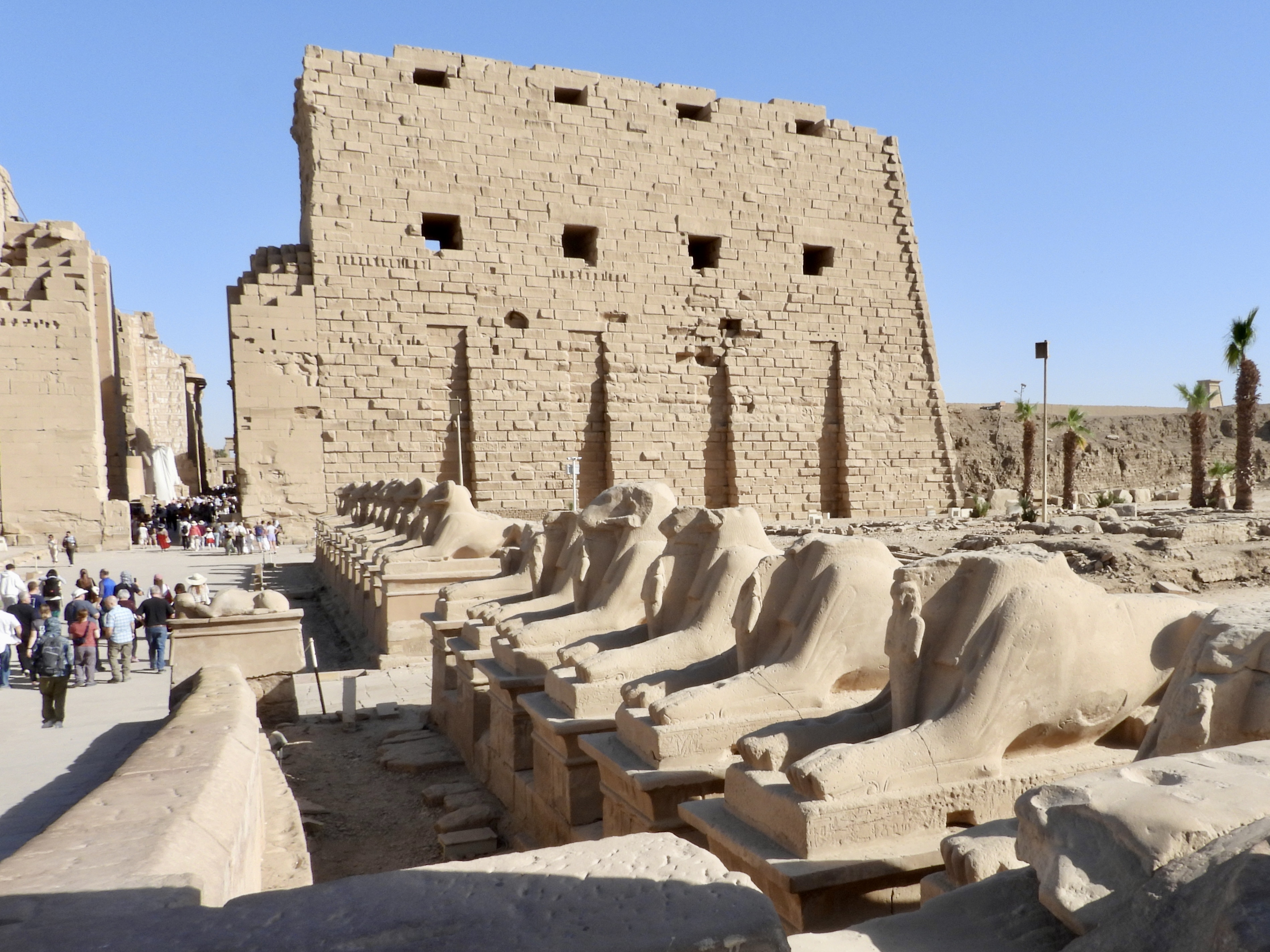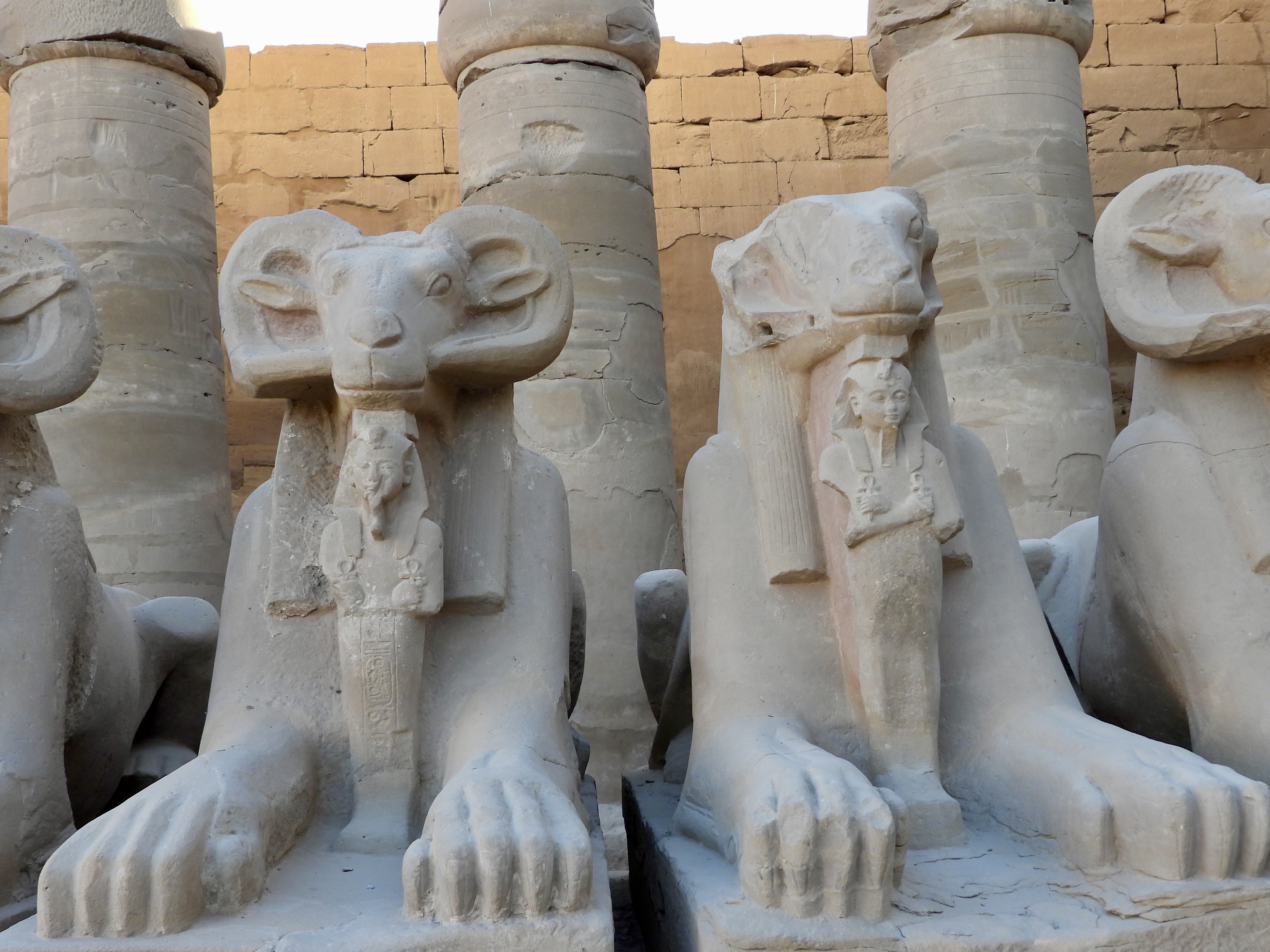 A long ceremonial avenue leads toward the entrance, lined with ram-headed sphinxes sacred to Amun. Each holds a small statue of a pharaoh between its front paws, symbolizing divine protection and the ruler’s connection to the gods. Walking between them felt like entering a space designed to humble visitors long before reaching the temple itself.