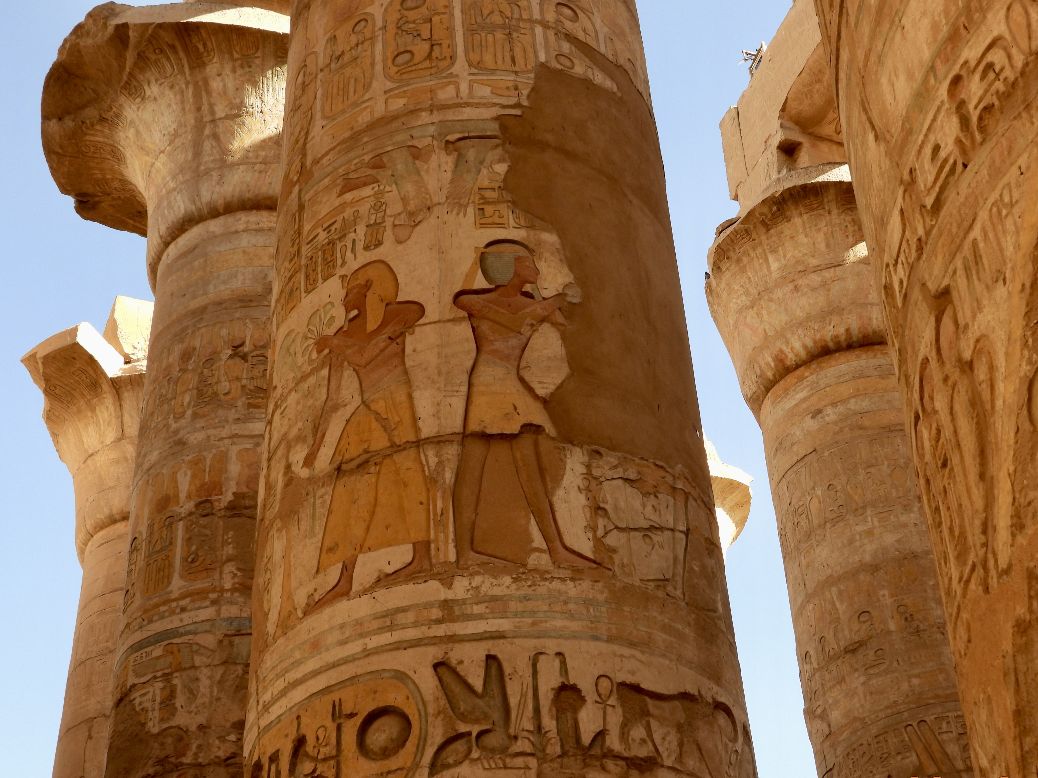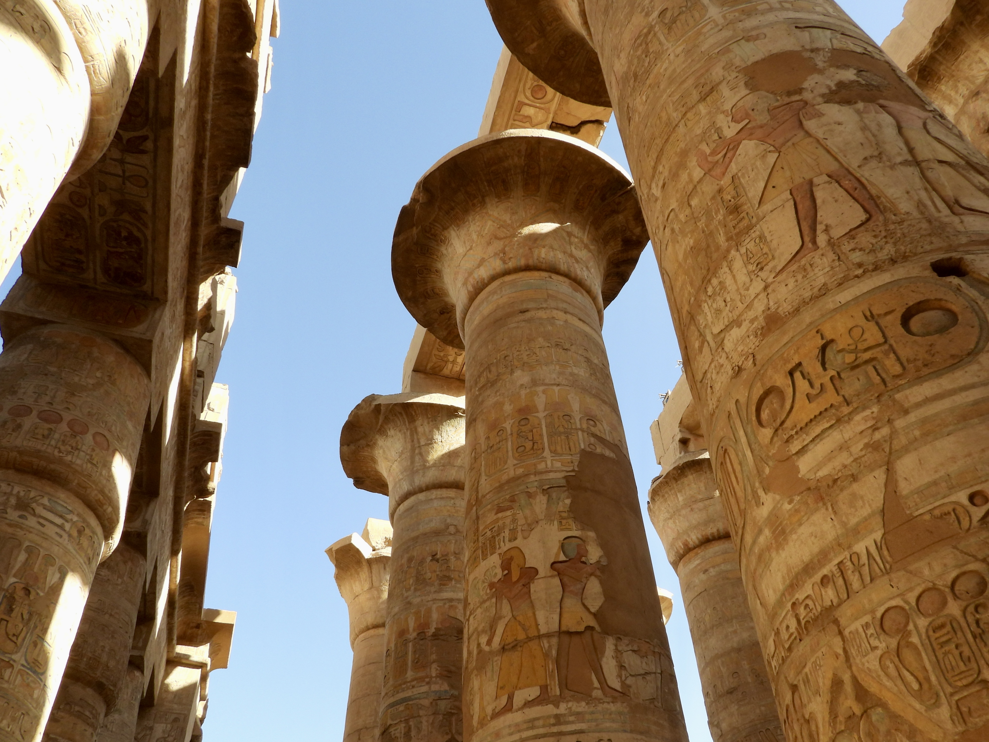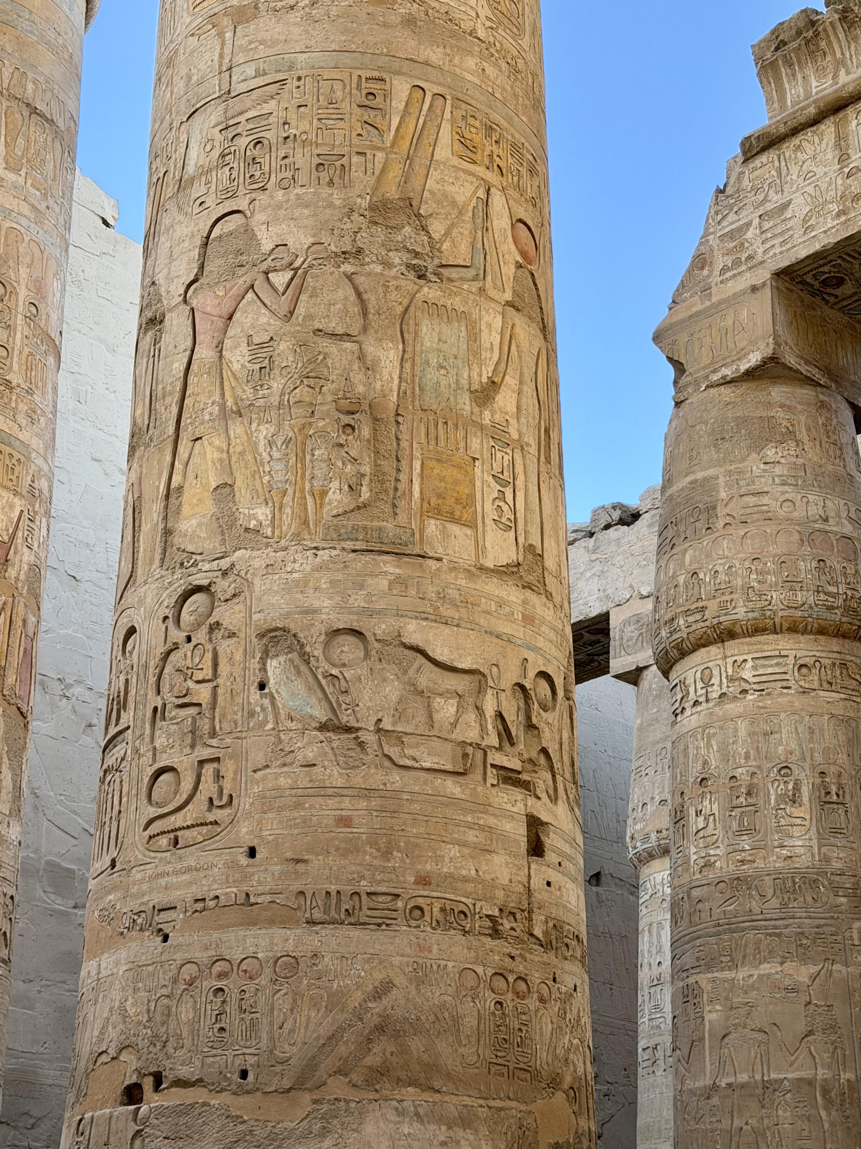 Towering stone columns rise in every direction like a forest carved from rock. Some reach nearly 70 feet high, their tops shaped like blooming papyrus plants. What amazed me most was the detail. Hieroglyphics covered nearly every surface, carved deeply into stone and still showing traces of original color, reds, blues, and ochres that somehow survived thousands of years.