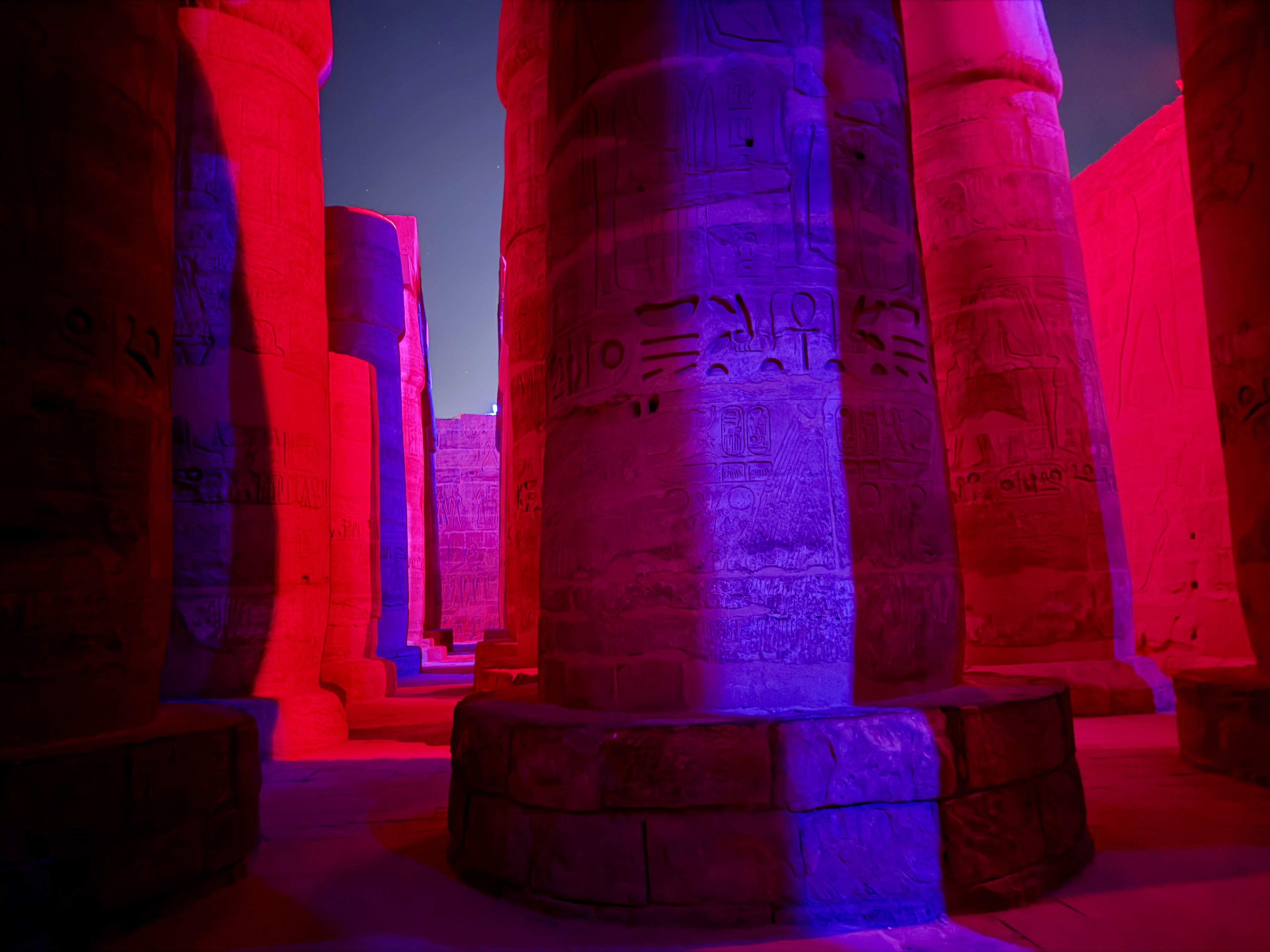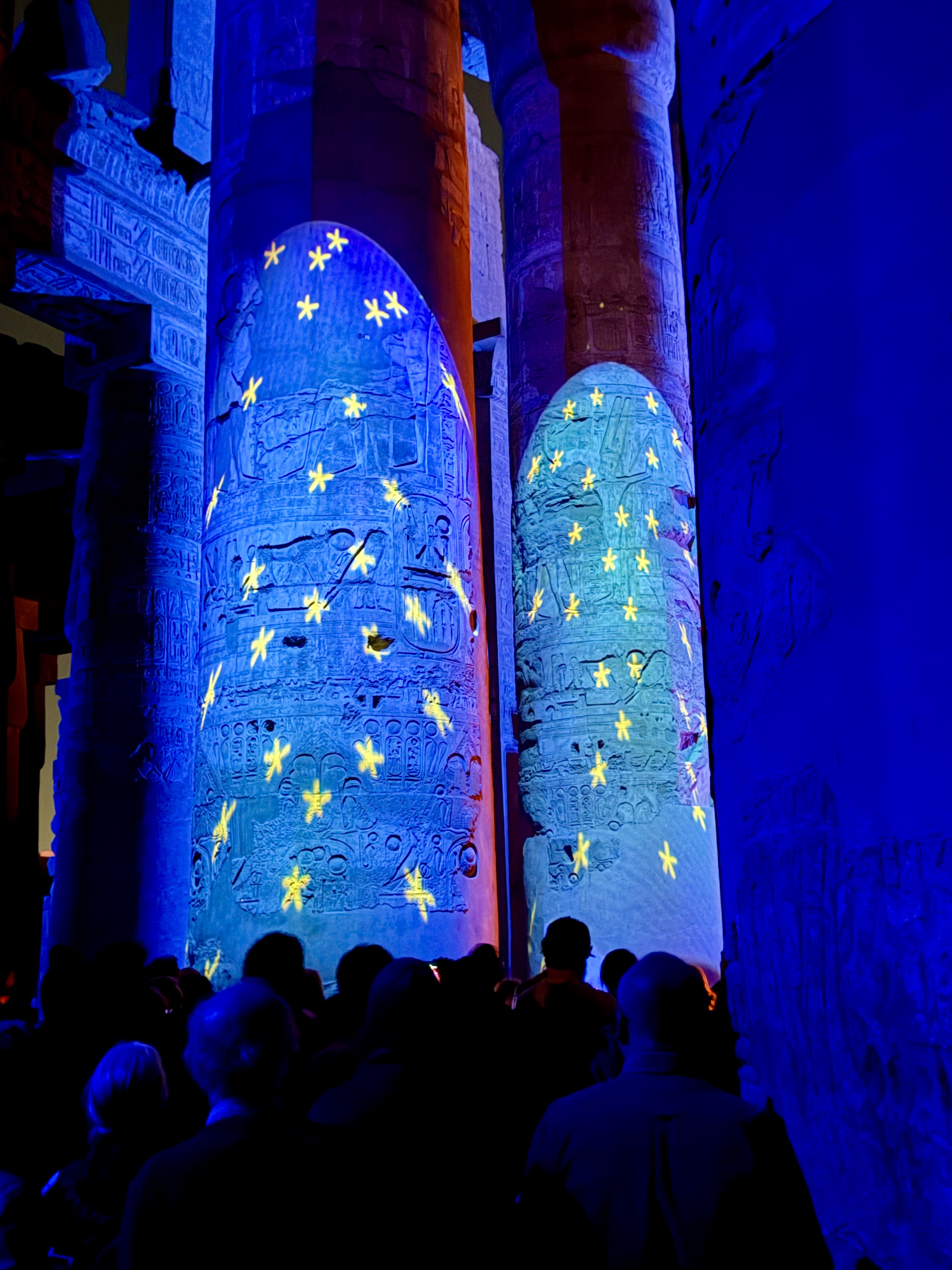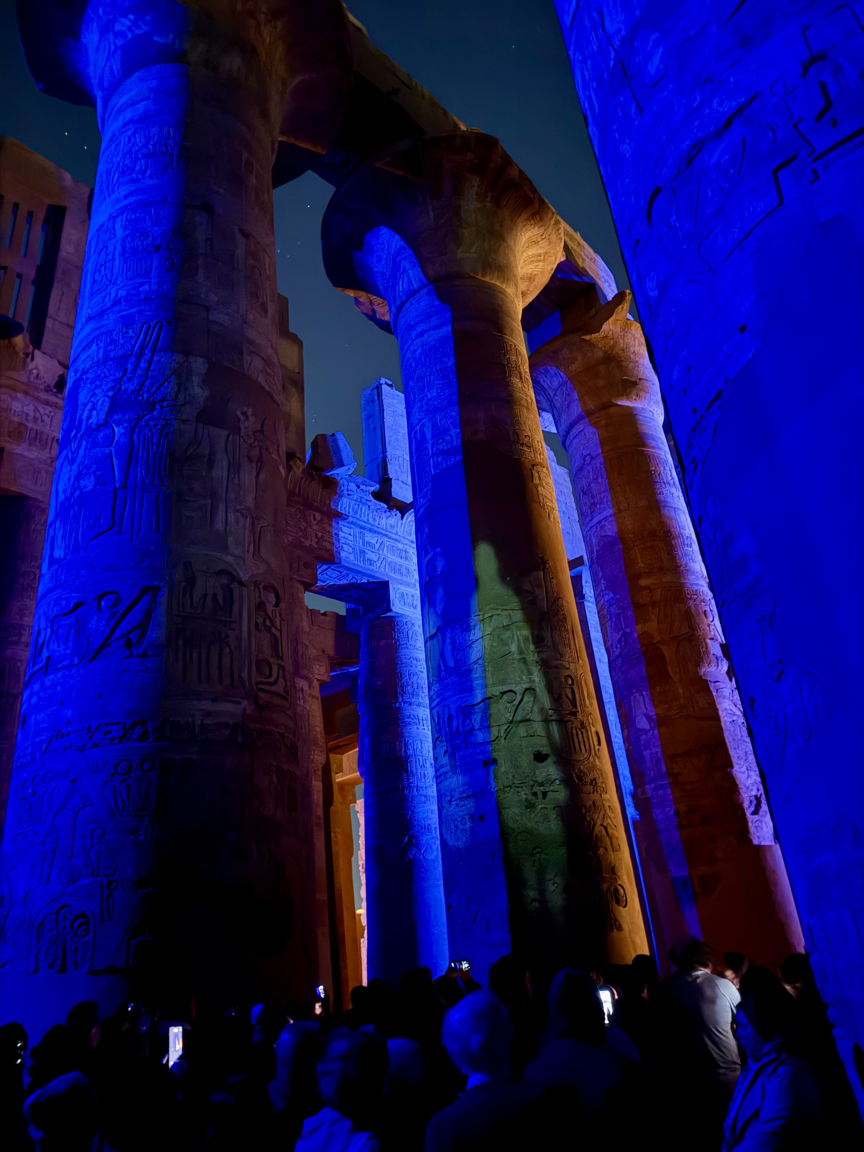 Lights rose slowly around us in a sweeping 180-degree arc, bathing the towering columns in shifting colors, reds, blues, and deep purples. During the day I had stared upward in awe at their height and detail. At night, surrounded by color and sound, the columns felt almost sacred. Hieroglyphs seemed to move as shadows passed across them, telling stories of offerings to the gods and victories meant to last forever.