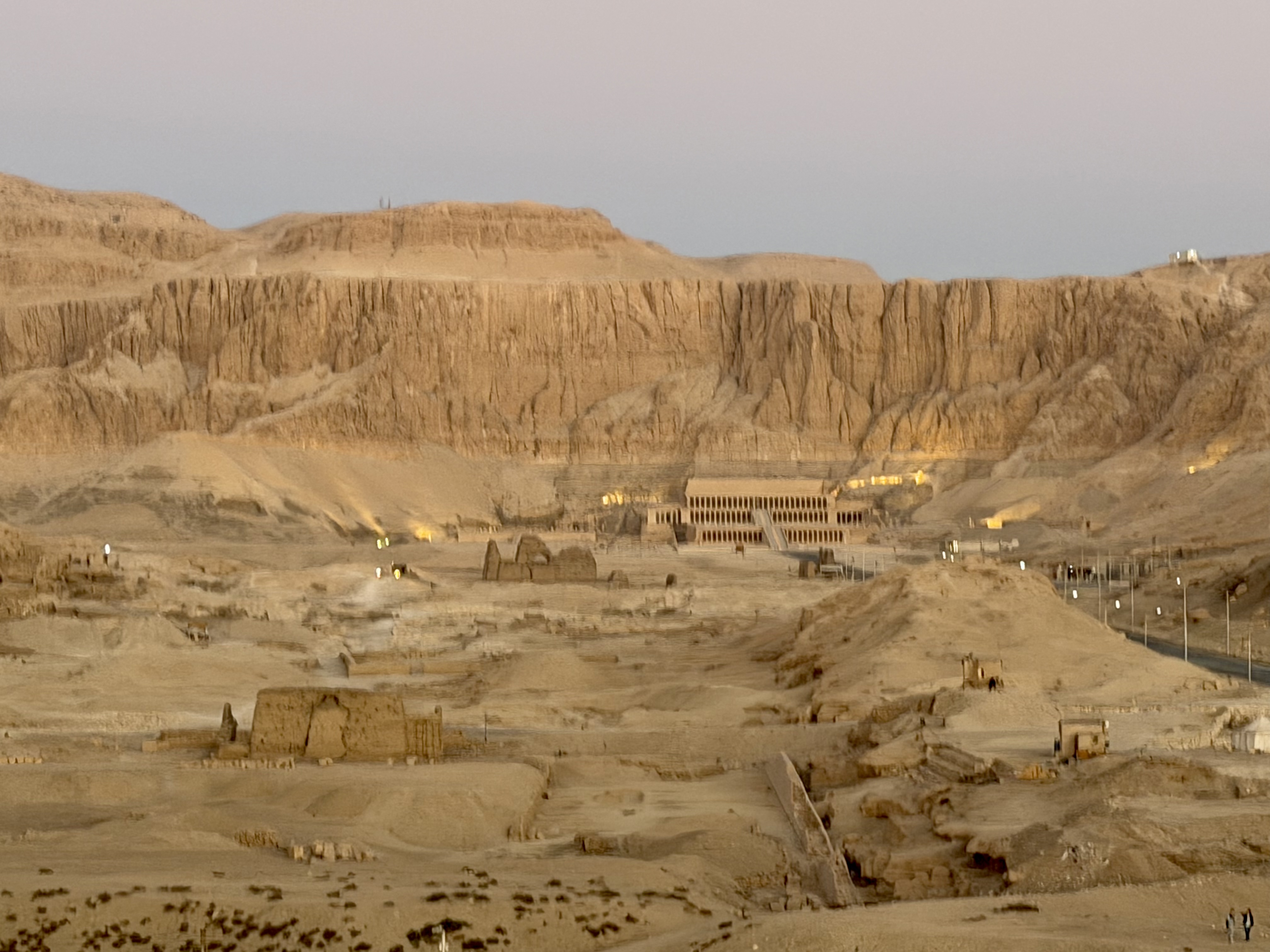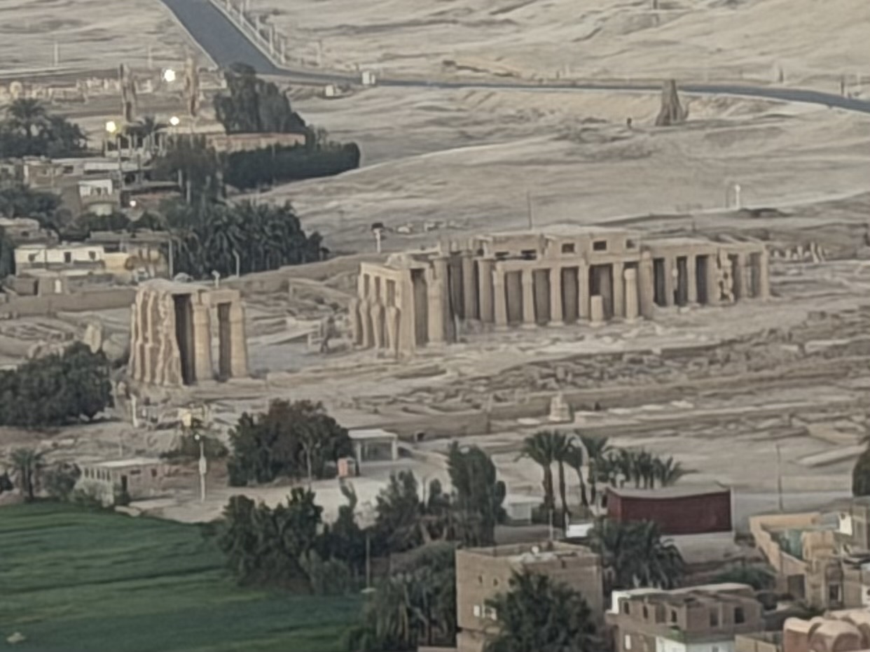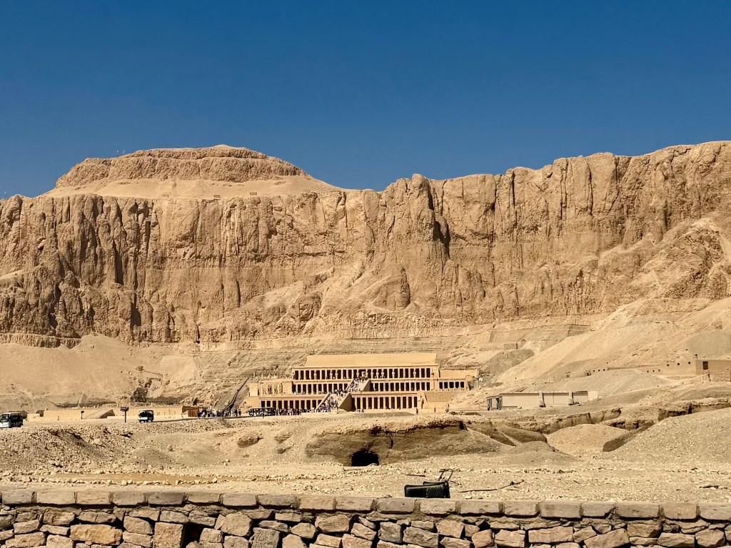 From our elevated vantage point we could clearly see the Valley of the Kings etched into the mountains below, entrances nearly invisible unless you knew where to look. Nearby stood the Temple of Queen Hatshepsut, its terraces blending seamlessly into the cliffs behind it, appearing less like a building and more like part of the mountain itself.
