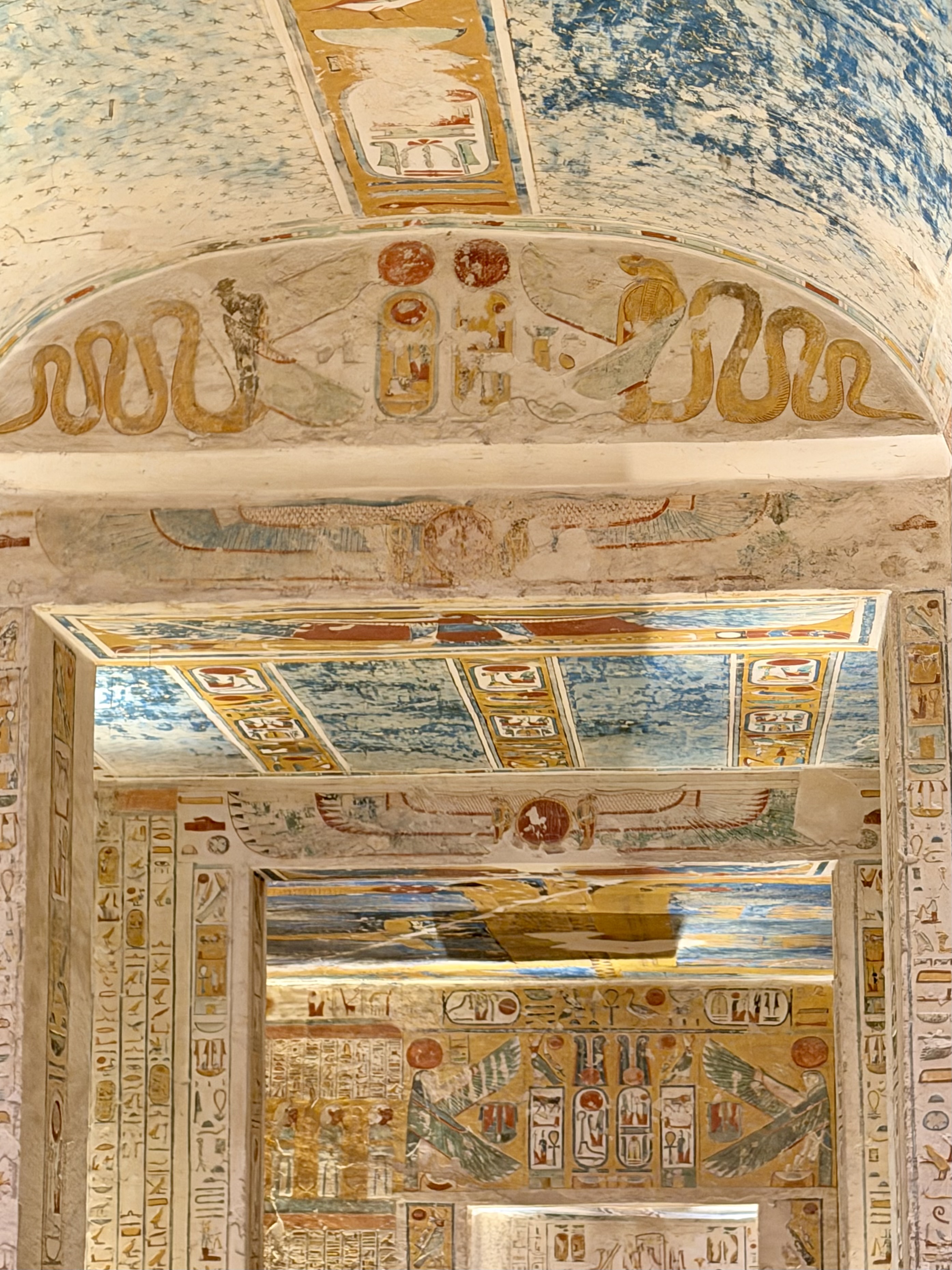 Scenes from sacred funerary texts describe the sun god’s journey through darkness toward rebirth. Standing beneath those painted ceilings felt like standing inside an ancient universe.