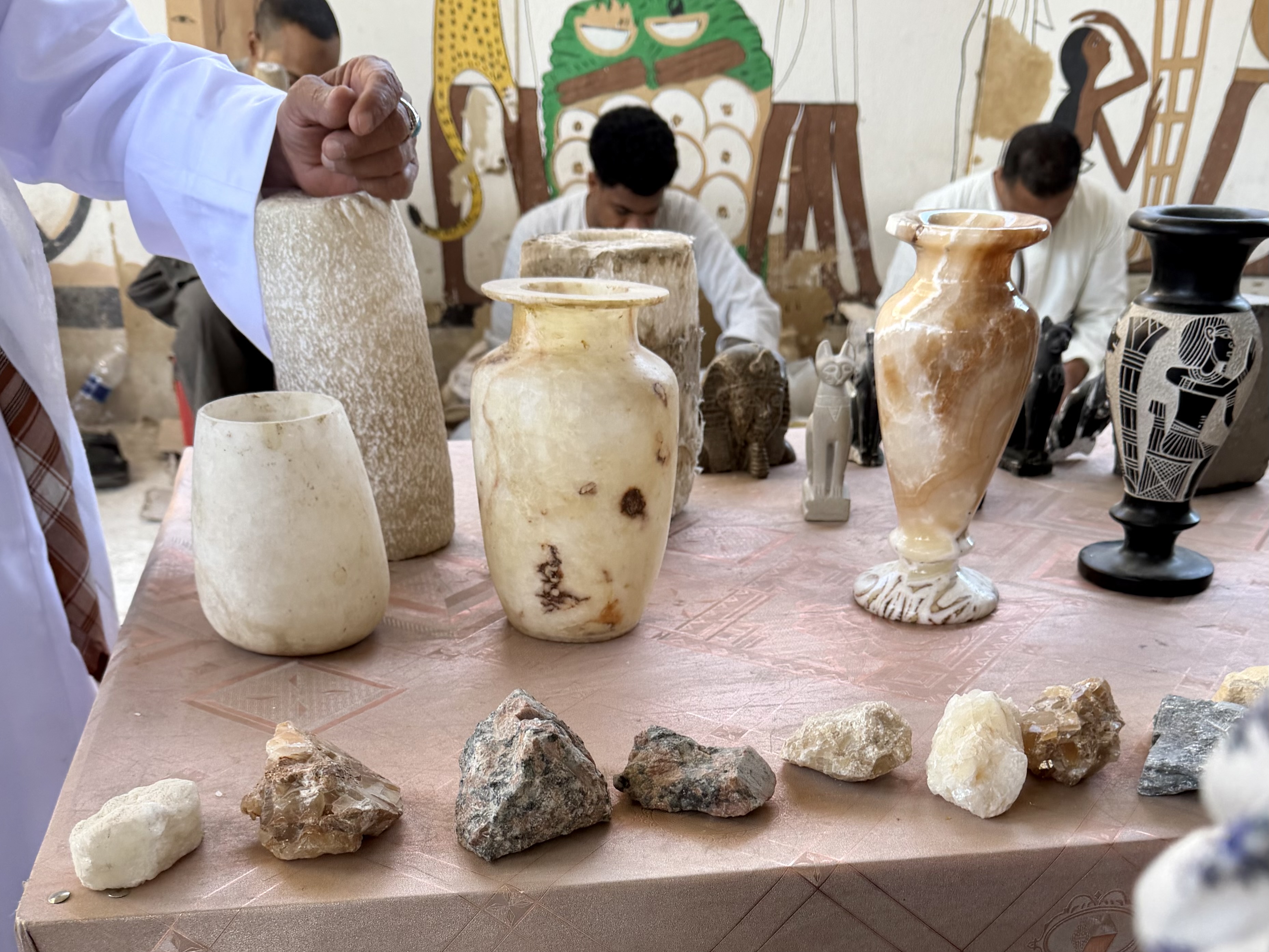 Inside the workshop, artisans demonstrated how alabaster and other stone are transformed into vases, sculptures, and candle holders using techniques passed down through generations. One artisan handed us two similar pieces and invited us to compare them. The machine-made version was noticeably heavier, dense and uniform. The handmade piece felt lighter, carefully shaped so light could pass through the stone itself.