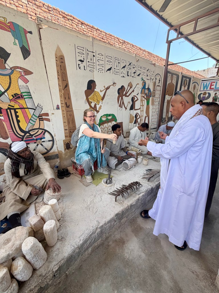 Alaa surprised all of us by purchasing six purple scarab beetles and presenting one to each member of our Egyptian tour family. In ancient Egypt, the scarab symbolized rebirth, protection, and renewal, associated with the rising sun and transformation.