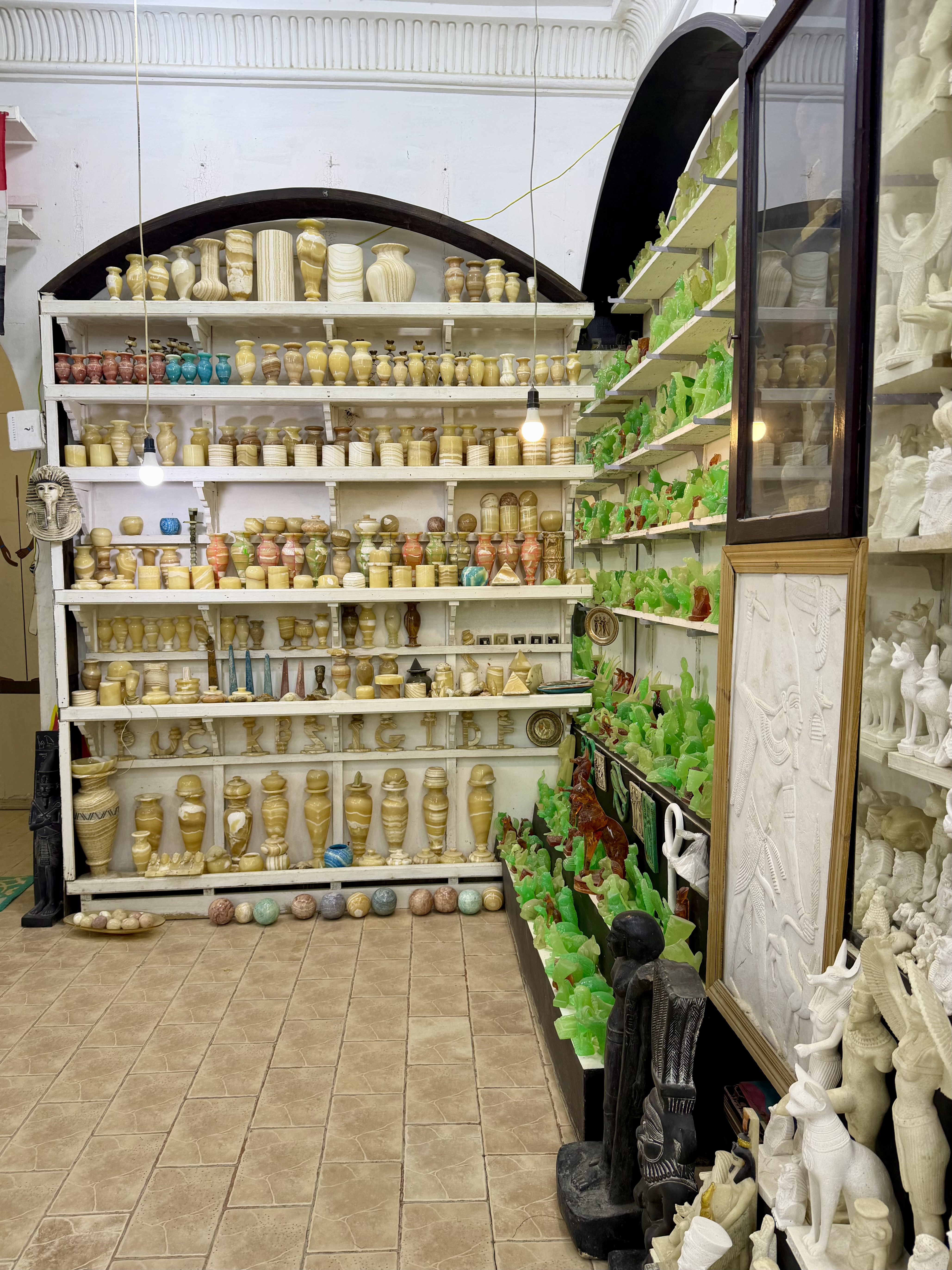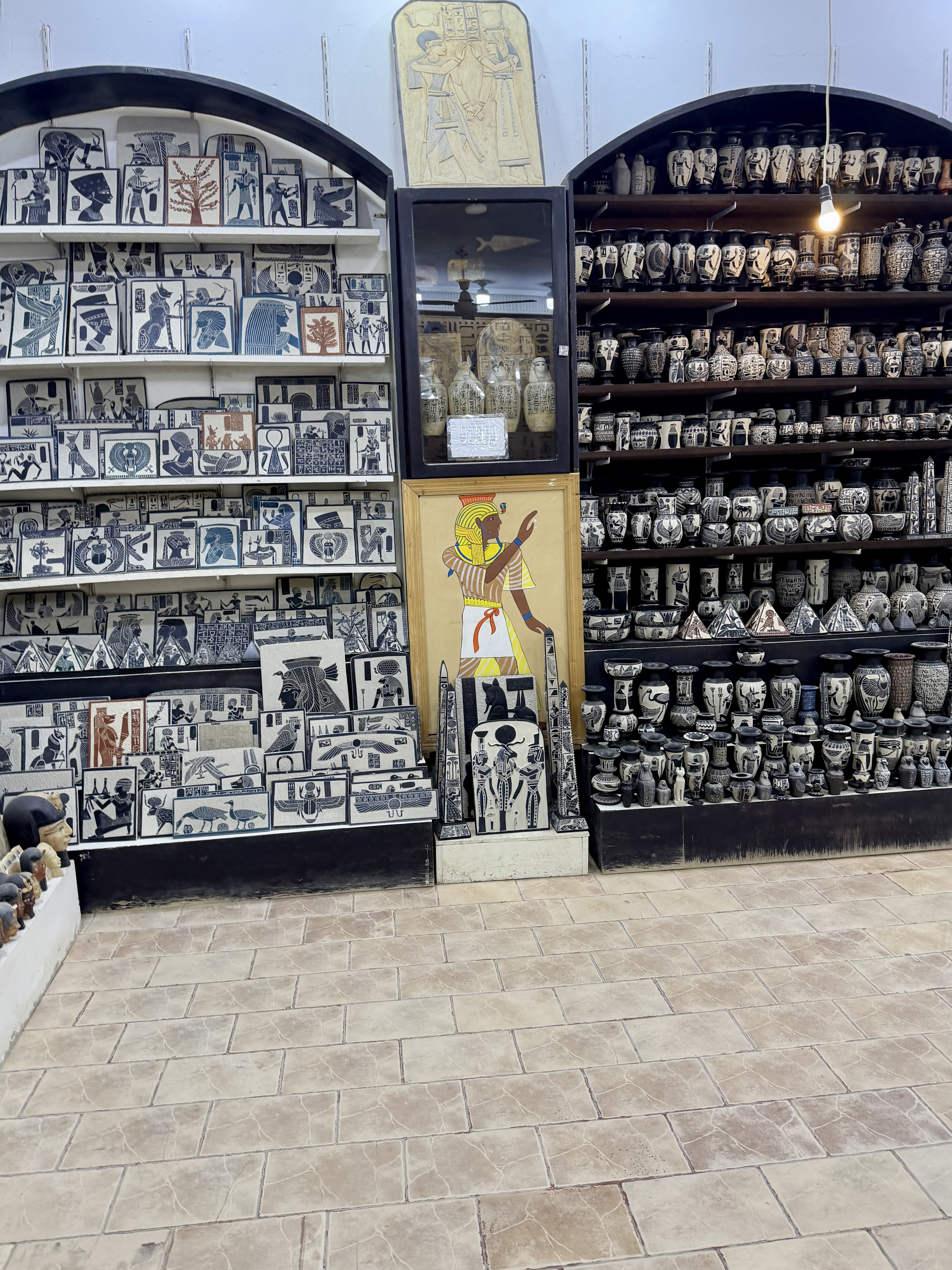 We selected a handmade alabaster candle holder, chosen specifically because when a candle is lit inside it glows warmly through the natural stone. Knowing it was hand carved made it even more meaningful. We also chose a black carved vase etched with Egyptian figures that immediately caught my eye.